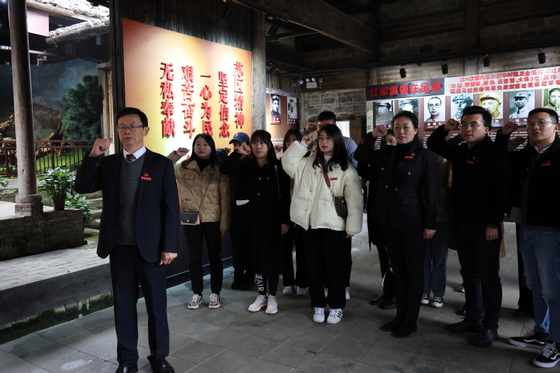 在讲解员的带领下,沿着当年红军走过的小道,全体人员怀着肃穆沉重的心情,有序参观了中央红军总卫生部旧址、中央红军总司令部旧址、中央红军总政治部旧址等红色革命旧地。大家认真听取讲解员的详细介绍,了解了旧址、旧居中展示的每一处史料、每一件纪念物、每一张朴实珍贵的红色文物,这些无不向在场人员诉说着那段红军将士为了革命理想浴血奋战的革命史。之后,在当年红一方面军司令部旧址,学院领导陈凌同志带领全体党员老师们重温入党誓词、缅怀革命先烈。