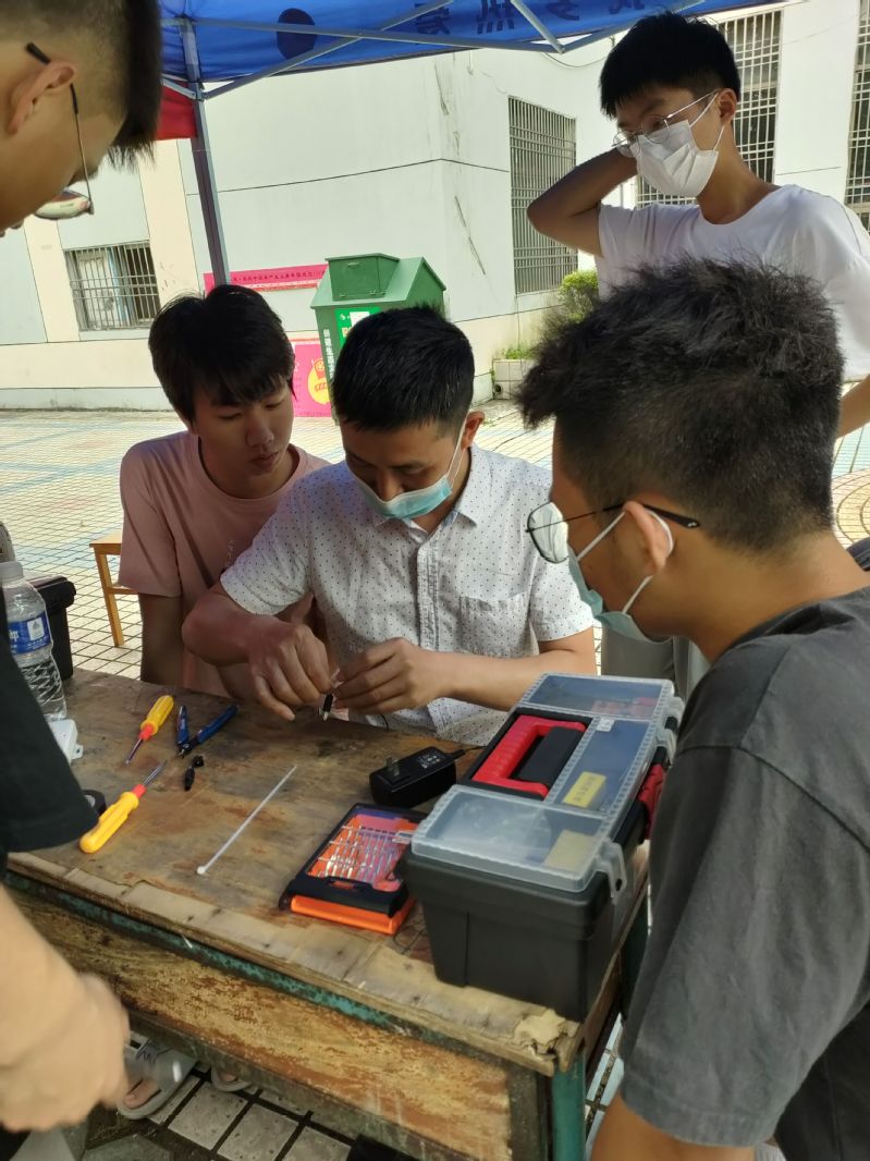 雨水虽断断续续,但前来维修的同学也络绎不绝。维修的物品主要有电风扇,电吹风,热水壶,台灯,充电宝等。活动现场气氛格外融洽,志愿者们热情地接待每一位同学,为其有序地登记电器问题,并耐心地为其解决问题,在各自擅长的领域尽力做到最好。志愿者们技术娴熟,态度认真,各司其职,实实在在为同学们解决电器的问题。尽管不是所有的电器都能如愿修复好,但志愿者们为同学服务的初心不移,使奉献、友爱、互助、进步的青年志愿者精神在青年一代中发扬光大。