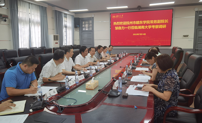 7月14日,由赣东学院、抚州市委组织部、抚州市科技局三部门联合组成的考察团,在赣东学院常务副院长邹自力带领下赴湖南大学考察交流,洽谈对口支援及加强合作交流事宜。赣东学院副院长陈坚、抚州市委组织部部务委员谢爱隆、抚州市科技局党组成员、科技项目服务中心主任曾爱民陪同考察,赣东学院、抚州市委组织部、抚州市科技局相关职能部门负责同志参加考察。
