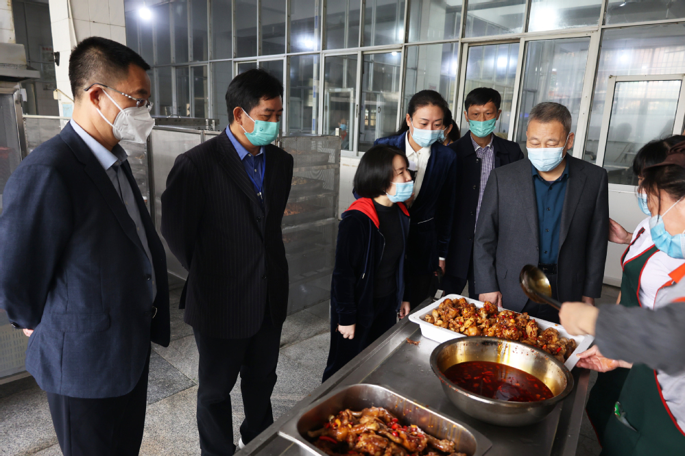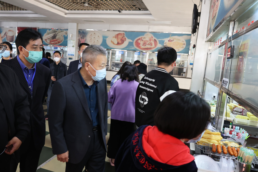 刘紫春一行来到学校职工之家和学生食堂,对食堂职工的住宿条件、食堂窗口的饭菜质量、厨房的卫生情况等做了重点考察,对疫情期间留校值守的教职工表示关切问候。