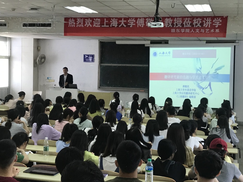 为了增强英语专业学生学习意识,培养学生学习兴趣,帮助学生更好地掌握英语翻译方向的学习方法,深入理解语言的跨文化交际及相关翻译技巧,我系特邀上海大学傅敬民教授于5月4日上午于二教阶十一教室开展题为“翻译研究前沿选题与学术论文写作”的学术讲座。讲座由系主任颜小英主持,英语专业全体教师及英语专业各年级学生共200余人与会。