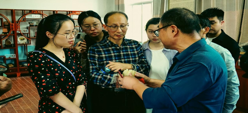 调研组最后一站来到金溪县秀谷一小,拜访抚州市“大米微书蜡石镶嵌工艺”传承人邓贡民老师。邓老师的“大米微书蜡石镶嵌工艺”是在每粒5到7毫米的大米上,用繁体、篆体、楷体书写。目前,邓老师能在一粒大米上写下60-70笔画的繁体字,四至八个字。如“潋灧夢湖”四字共有六十多笔,粒米展现,并且笔笔相连,紧紧环扣,令人称绝。邓老师的作品参加过首届抚州市非遗展、首届江西省文博会展、江西省“文化的力量”巡展、第十五届深圳国际文化交流展,邓老师在金溪竹桥古村设有个人工作室,被列为金溪县管拔尖人才。