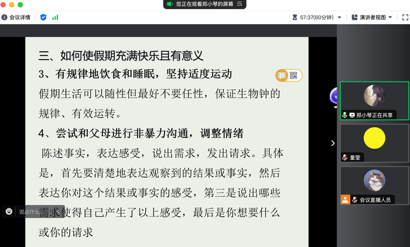 讲座中,郑小琴从假期综合症的具体表现、产生原因和解决办法三方面入手,通过确立目标、用积极方式获取多巴胺、有规律地饮食和睡眠、坚持适度运动、与父母积极沟通、培养兴趣爱好等方式提升假期质量。