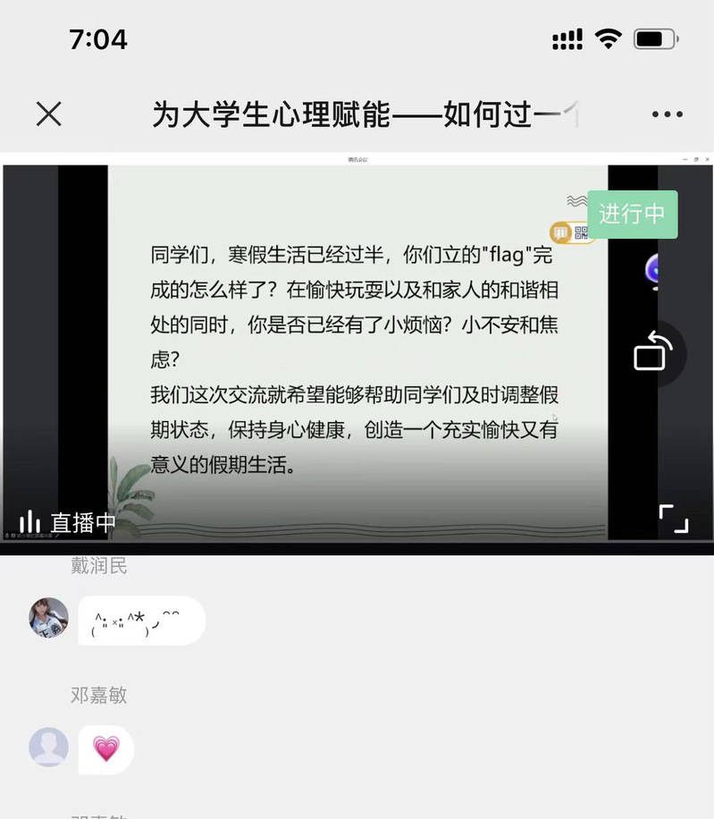为进一步加强寒假期间全校学生心理健康疏导,让学生度过一个平安、美好而高质量的假期。2月5日晚7点,我校举办了主题为“为大学生赋能—如何过一个快乐而有意义的假期”的线上讲座,本次讲座由东华理工大学副教授郑小琴主讲,我校全体班级心理委员及部分学生代表参加。