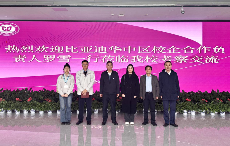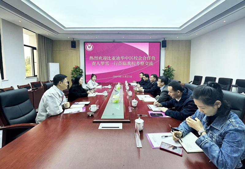 11月22日下午,比亚迪股份有限公司华中区校企合作负责人罗雪、比亚迪抚州园区人事负责人万有达、比亚迪抚州园区招聘经理肖青一行3人来我校调研交流,洽谈校企合作事宜。党委员员、副校长茶金学热情接待了访客,发展规划处、科技处、团委、招就处等相关同志陪同调研交流。