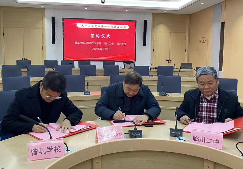 12月30日,我校马克思主义学院、临川二中、曾巩学校大中小学思政课一体化建设联盟签约仪式暨座谈会在学校创新课堂举行,马克思主义学院院长邹志坚,临川二中党委委员、副校长符国桢,曾巩学校校长尧晋龙代表三方签约。临川二中、曾巩学校、我校马克思主义学院教师代表参加签约仪式。