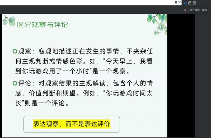 在讲座中,周双珠以大学生寒假在家的烦恼为切入,解析了孩子的成长发展需求和家庭生命周期转折带来的变化,提出了亲子有效沟通的六大技巧,鼓励家长与孩子建立平等关系,在与子女相处时及时调整自身心态和用表达情绪替代情绪化表达。