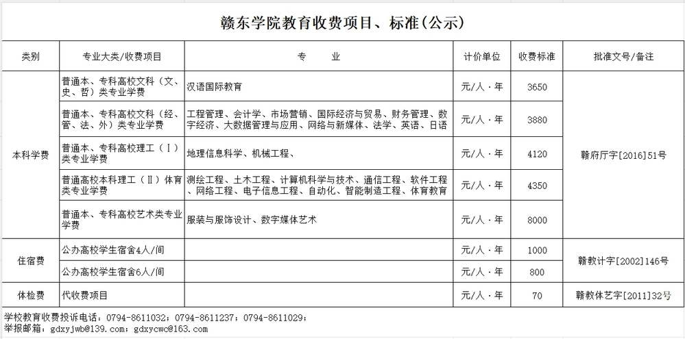 赣东学院教育收费项目、标准(2023年)
