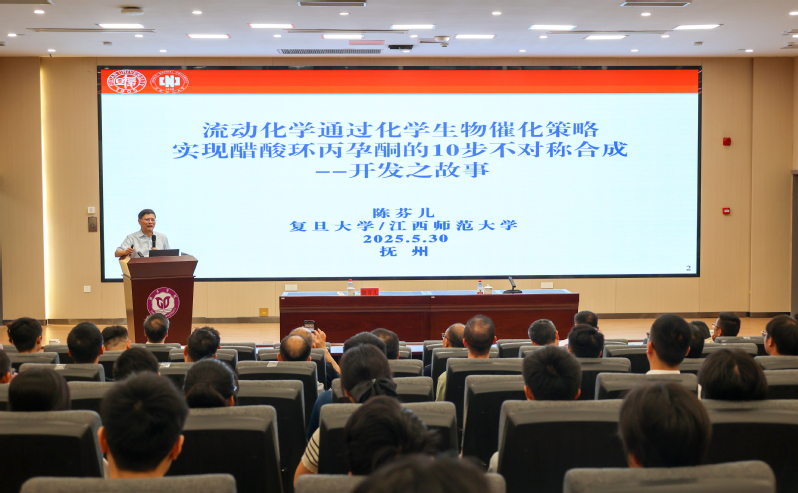 5月30日下午,中国工程院院士、江西师范大学校长陈芬儿来到赣东学院,在明德楼201报告厅作题为《流动化学通过化学生物催化策略实现醋酸环丙孕酮的10步不对称合成——开发之故事》的专题学术讲座。本次讲座系抚州市2025年“全国科技工作者日”主场活动重要环节。