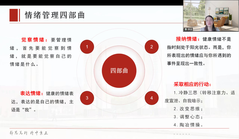 在讲座中,李洁以现实案例为引,强调了大学生管理情绪和压力的必要性。通过深入浅出地讲解“觉察-接纳-表达-行动”的情绪管理四部曲和科学应对压力七步法,帮助大学生为新学期做好准备,掌握有效的调节策略,同时鼓励善用支持资源,促进心理韧性的增强。