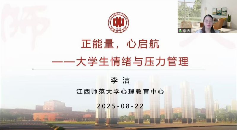为帮助学生调整心态,以积极状态迎接新学期,8月22日上午,学生工作处特邀江西师范大学心理教育中心负责人李洁教授为我校开展以“大学生情绪与压力管理”为主题的线上讲座,近百名学生参加。