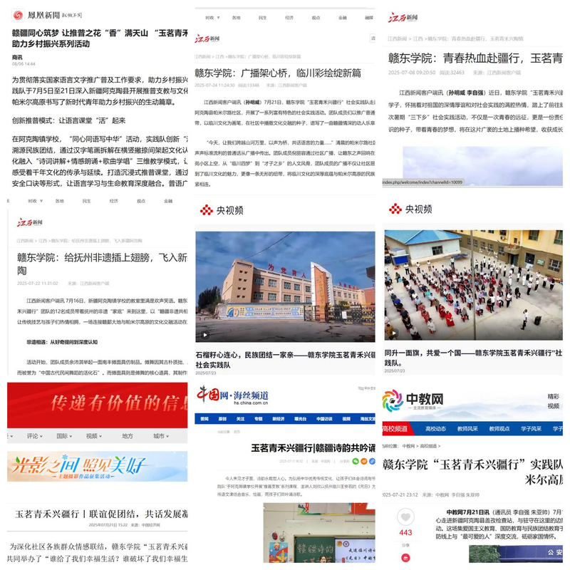 活动期间,团队实践成果受到社会各界广泛关注,被央视频、中教网、中国网、凤凰新闻、江西新闻等国家级、省级媒体平台报道百余次。除共青团新疆区委的感谢信外,团队还收到来自阿克陶前方指挥部、阿克陶县教育局、阿克陶镇政府、雪松中学、新疆阿克猫农业开发有限公司等共12家单位的感谢与表彰。