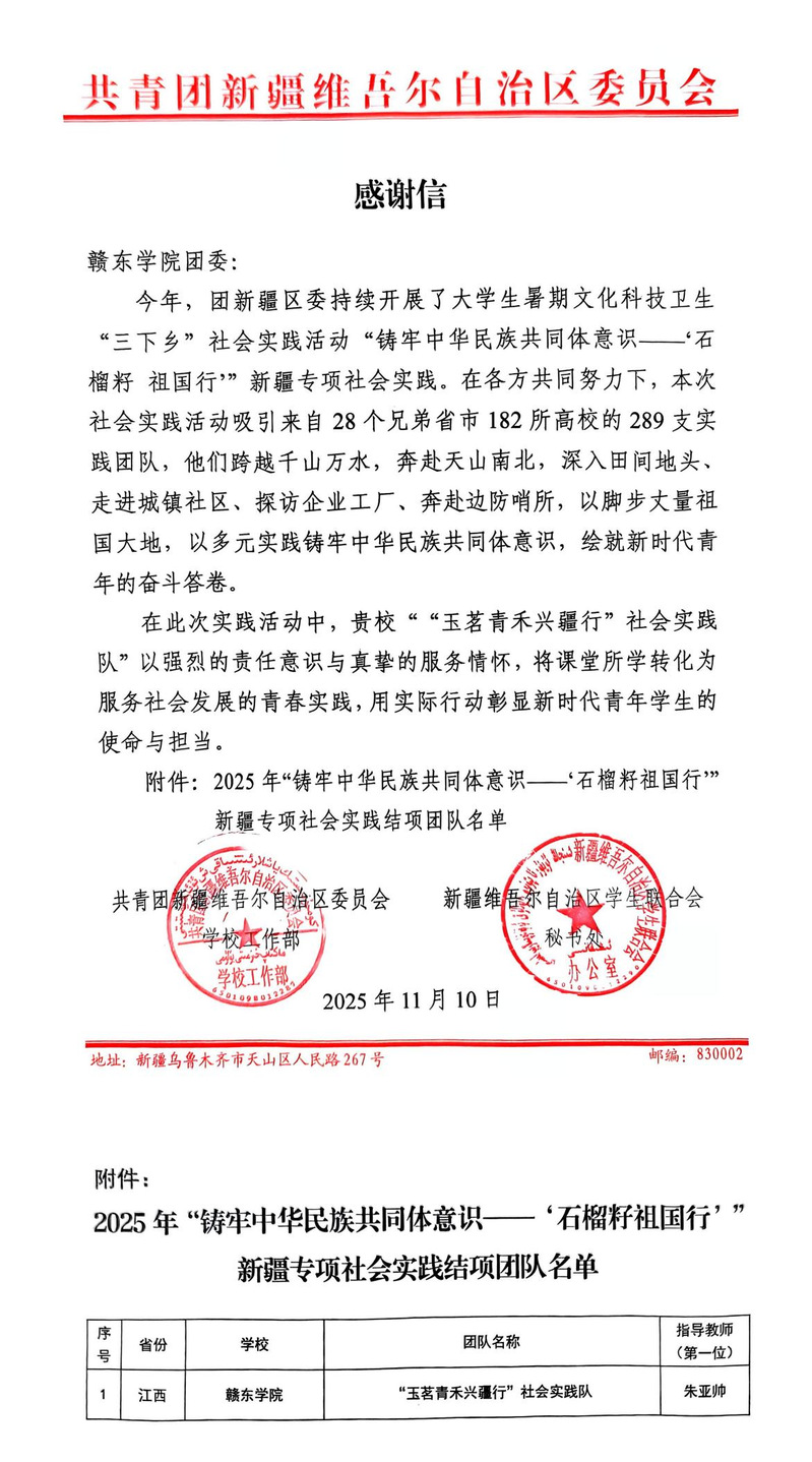 近日,赣东学院“玉茗青禾兴疆行”社会实践队,收到共青团新疆维吾尔自治区委员会发来的感谢信。实践队通过文化互鉴、服务奉献等实际行动,为铸牢中华民族共同体意识注入了青春活力。此前,该团队成功入选并圆满完成共青团中央等单位组织的“铸牢中华民族共同体意识——‘石榴籽祖国行’”新疆专项社会实践,深刻践行了民族团结精神,获国家级结项认定。