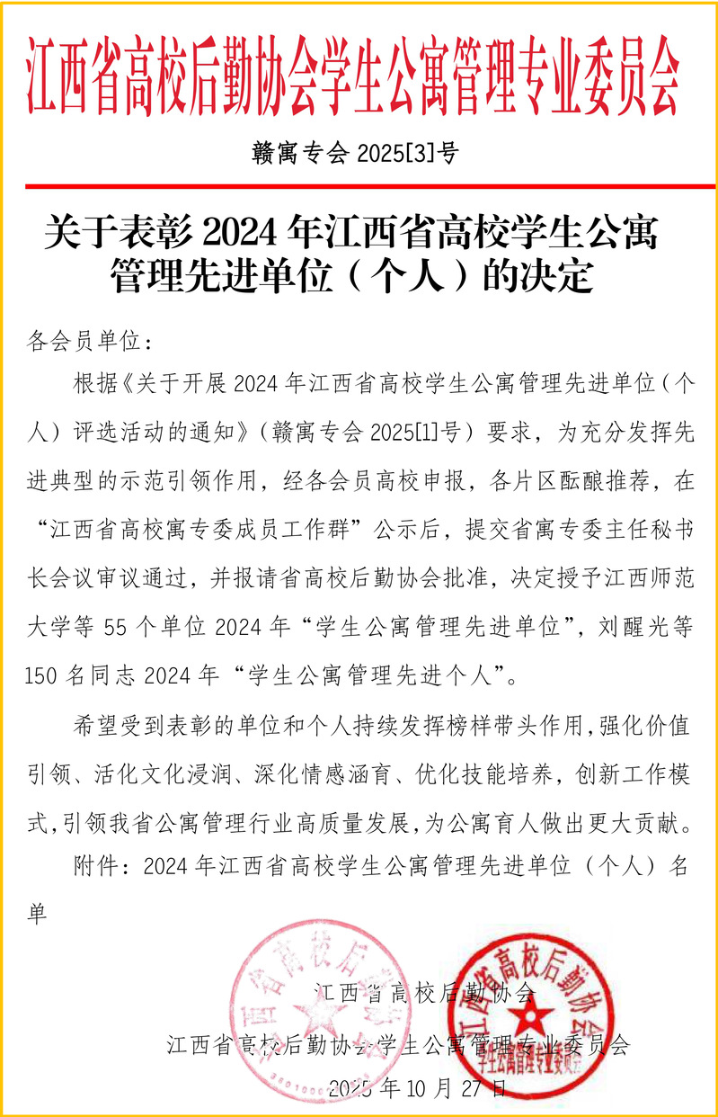 近日,江西省高校后勤协会学生公寓管理专业委员会发布《关于表彰2024年江西省高校学生公寓管理先进单位(个人)的决定》,赣东学院在此次评选中再度斩获多项省级荣誉。学校连续四年蝉联“学生公寓管理先进单位”称号,党委学生工作部张建灿等老师获“学生公寓管理先进个人”。