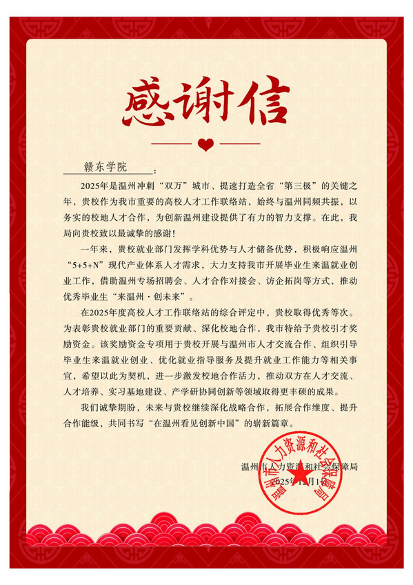 近日,赣东学院收到来自温州市人力资源和社会保障局的感谢信。在温州市2025年度高校人才工作联络站综合评定中,赣东学院脱颖而出,荣获“优秀”等次,并获得温州市特予的专项引才奖励资金。