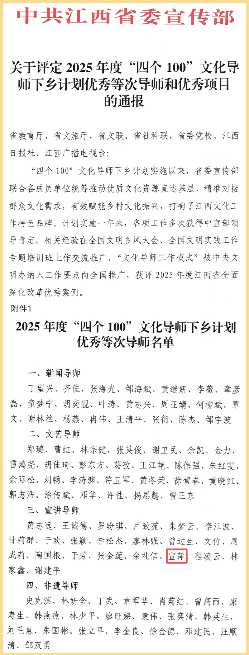近日,中共江西省委宣传部公布《关于评定2025年度“四个100”文化导师下乡计划优秀等次导师和优秀项目的通报》,赣东学院宣萍老师获评2025年度宣讲导师优秀等次,生动体现了学校教师投身基层文化实践、助力乡村振兴的专业能力与责任担当。