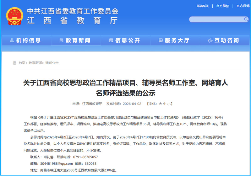 此次评选严格按照《关于开展江西省2025年度高校思想政治工作质量提升综合改革与精品建设项目申报工作的通知》部署要求,经学校推荐、通讯评审、现场答辩等多轮严格筛选,最终拟确定高校思想政治工作精品项目35项、辅导员名师工作室10个、网络育人名师10名。