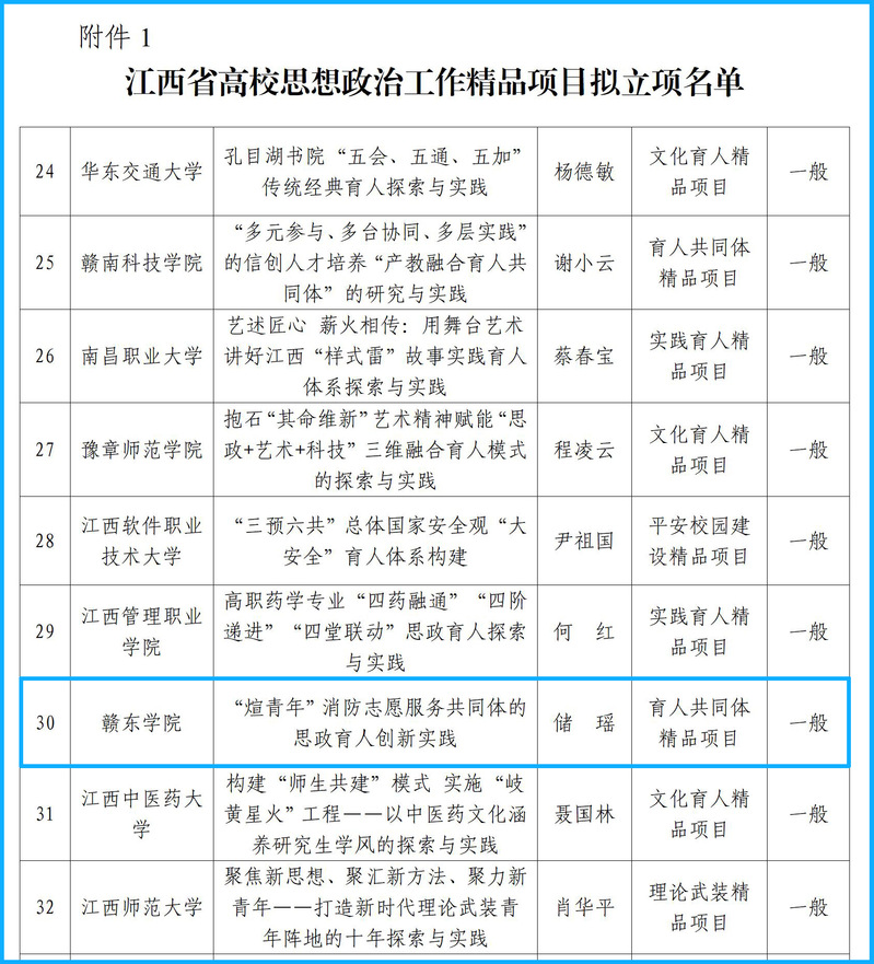 其中,赣东学院教师储瑶牵头申报的《“煊青年”消防志愿服务共同体的思政育人创新实践》项目,成功入围2025年江西省高校思想政治工作精品项目拟立项名单。这既是对我校思想政治工作成效的充分肯定,也是我校校地合作、服务地方的成果展现。下一步,学校将持续利用与抚州市消防共建的育人平台,落实立德树人根本任务,全面提升学生思想政治工作质量,努力培养堪当民族复兴重任的时代新人。